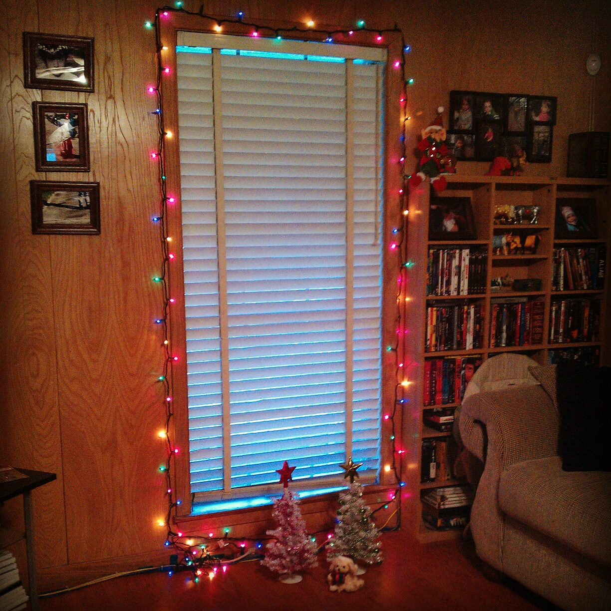 | He wrapped the table and strung up lights (and on a different night brough t the kids those trees) |